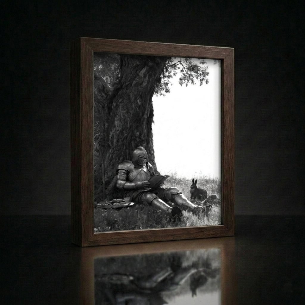 Your GlowFrame arrives with the wooden LED frame, your chosen double-sided Knight art print, a power cable, and if selected, your free LED dimmer remote. Everything you need to hang it and light it up is included.