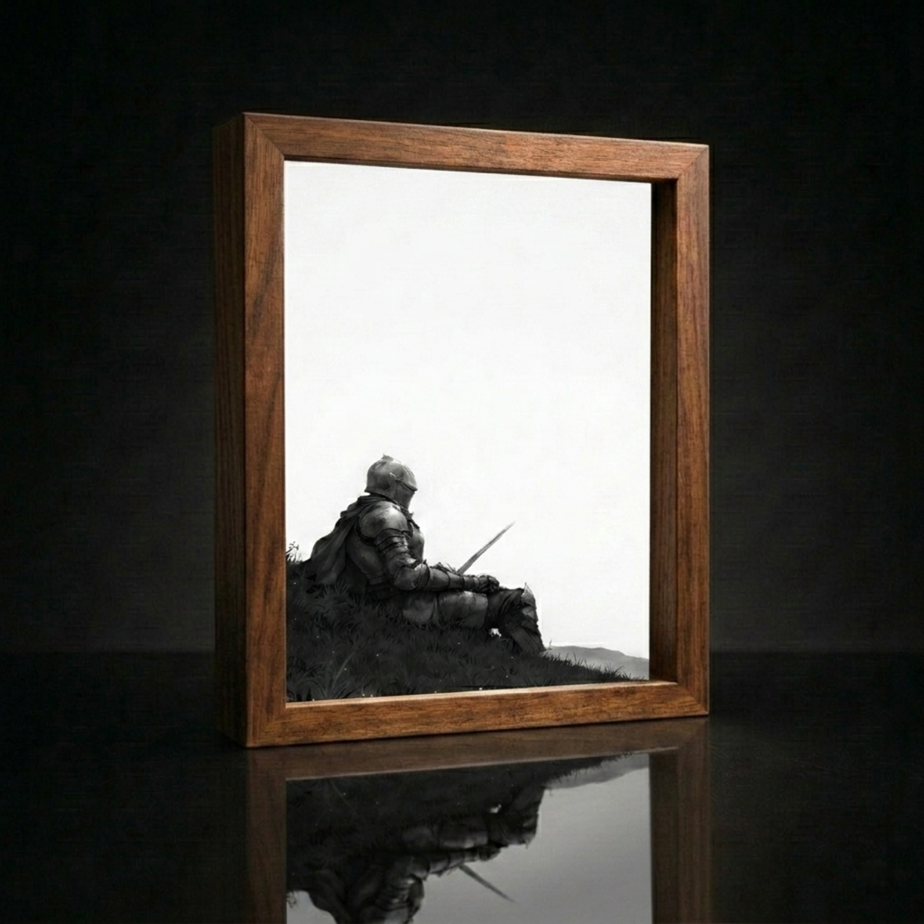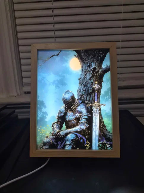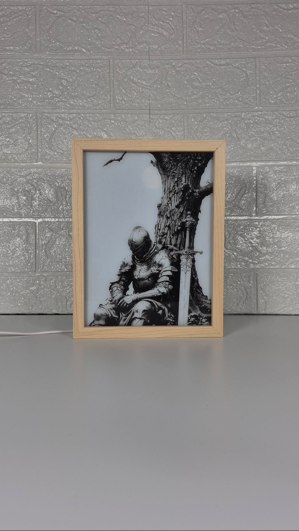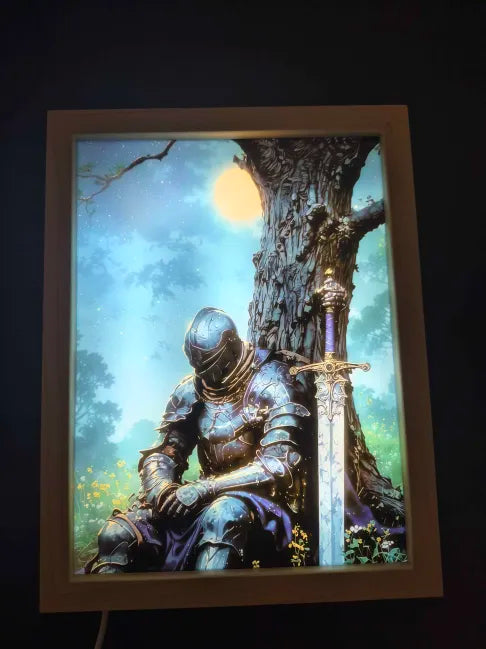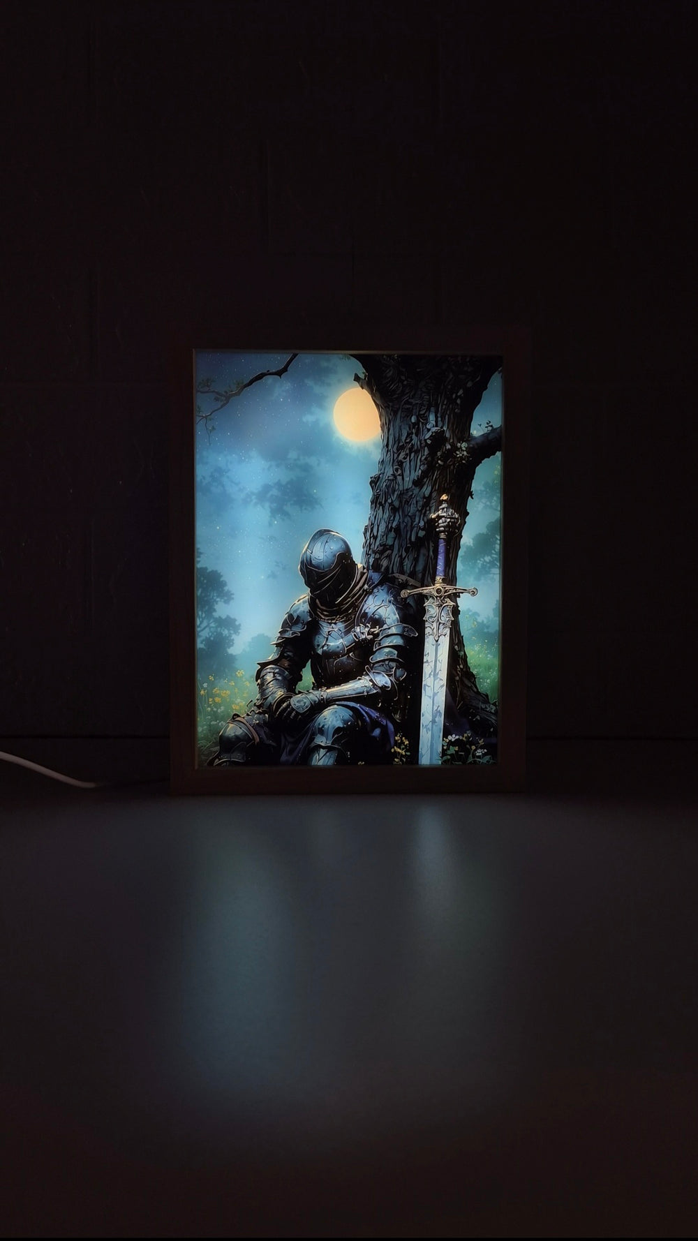 Your GlowFrame arrives with the wooden LED frame, your chosen double-sided Knight art print, a power cable, and if selected, your free LED dimmer remote. Everything you need to hang it and light it up is included.
